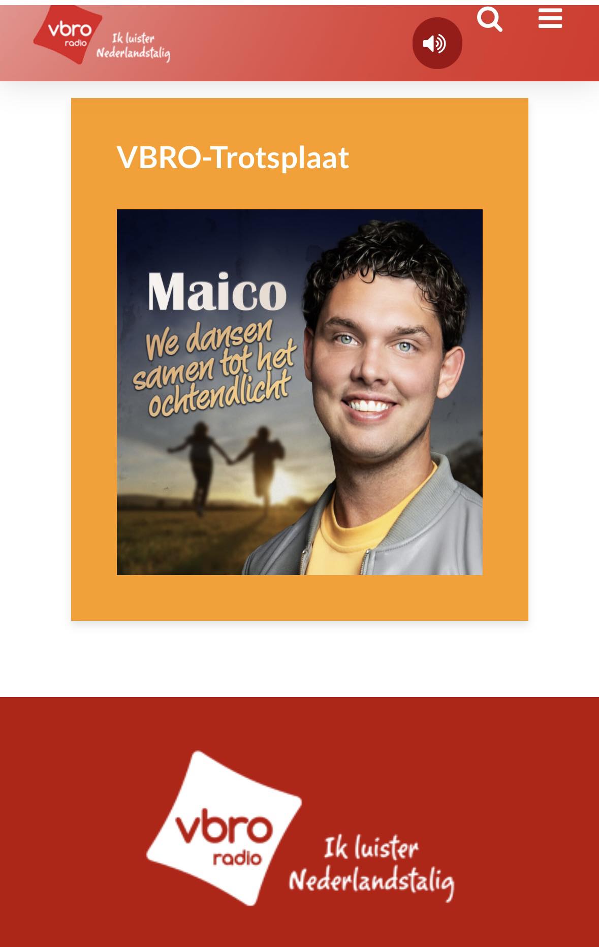 Iedere week kiest de VBRO-Muziekredactie een nieuwe Trotsplaat. Vanaf maandag 30 juni is dat ‘We Dansen Samen Tot Het Ochtendlicht’, de gloednieuwe single van zanger Maico! Hij mag dus met deze nominering de zomervakantie binnenstappen! En hoe! Met een pakkend, catchy én dansbaar nummer. ‘We Dansen Samen Tot Het Ochtendlicht’ is de allernieuwste zomer-single van de artiest uit Enschede. Hiermee zet Maico de ingeslagen koers succesvol verder. Ruben Zonnebeld schreef wederom de tekst en de mannen van Sonic Solutions zorgden voor een hitgevoelige productie. ‘We Dansen Samen Tot Het Ochtendlicht’ verschijnt via Hit It! Music, het label waar Maico zich al sinds 10 jaar aan verbonden heeft. Met een goed gevulde agenda aan zomeroptredens zal Maico ook met ‘We Dansen Samen Door Het Ochtendlicht’ zich weer flink in de kijker spelen. Onze nieuwe VBRO-Trotsplaat!